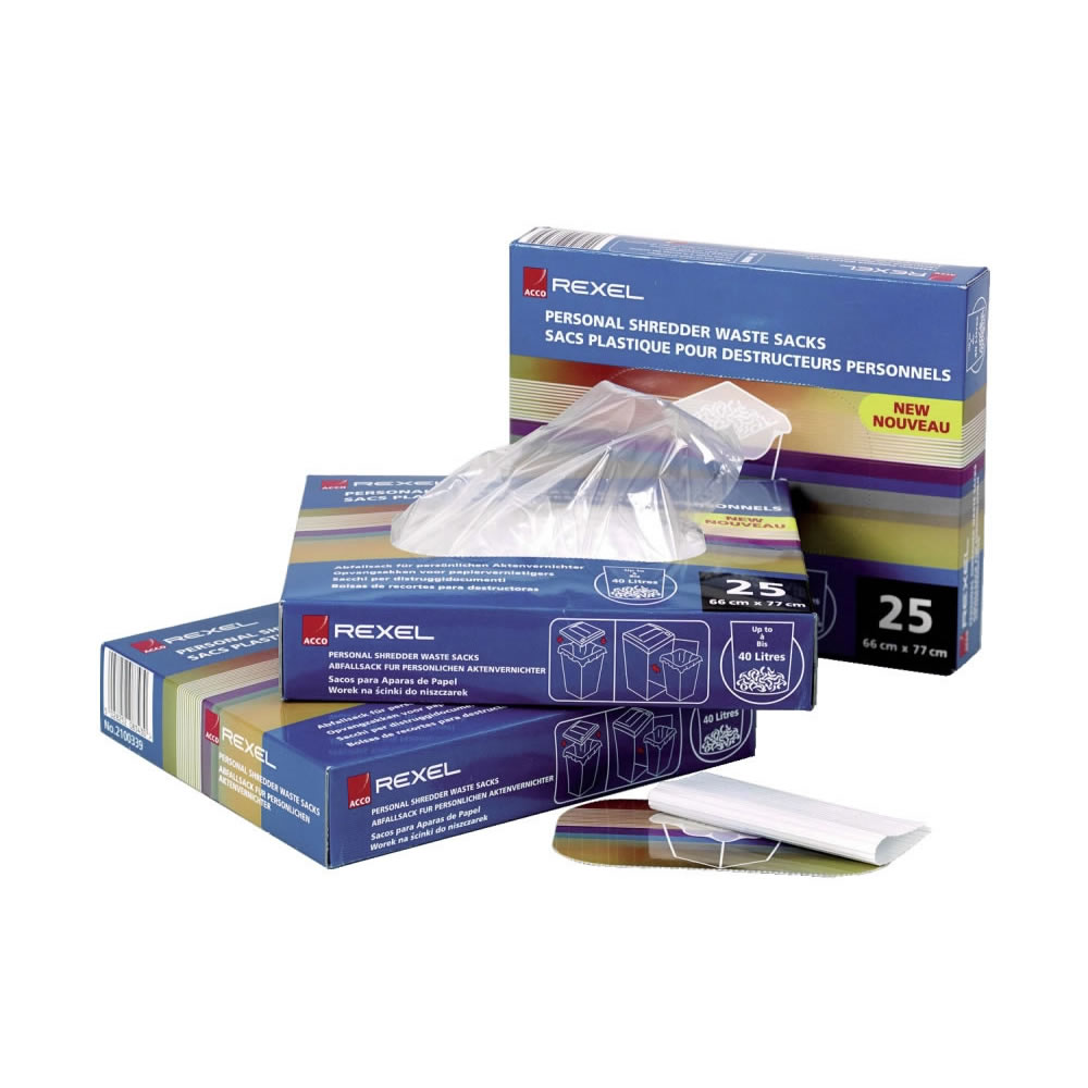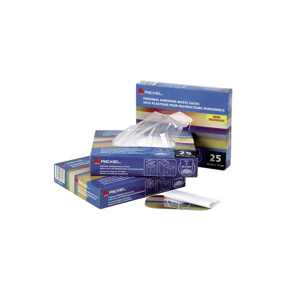 100 Bolsas Rexel para destructora AS100 - 40l. . Nuestra gama de sacos para restos se entrega en diferentes tamaños para adaptarse a las destructoras Rexel seleccionadas. Fabricadas en polipropileno d...