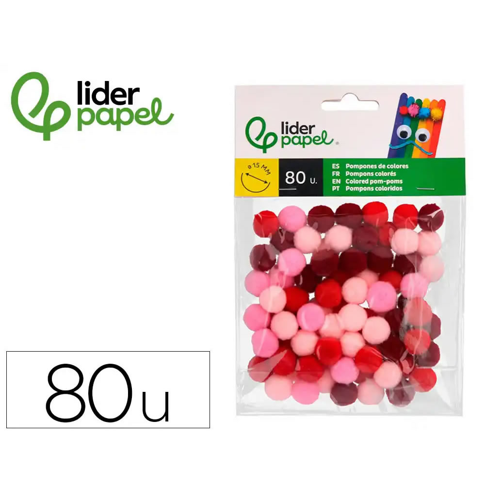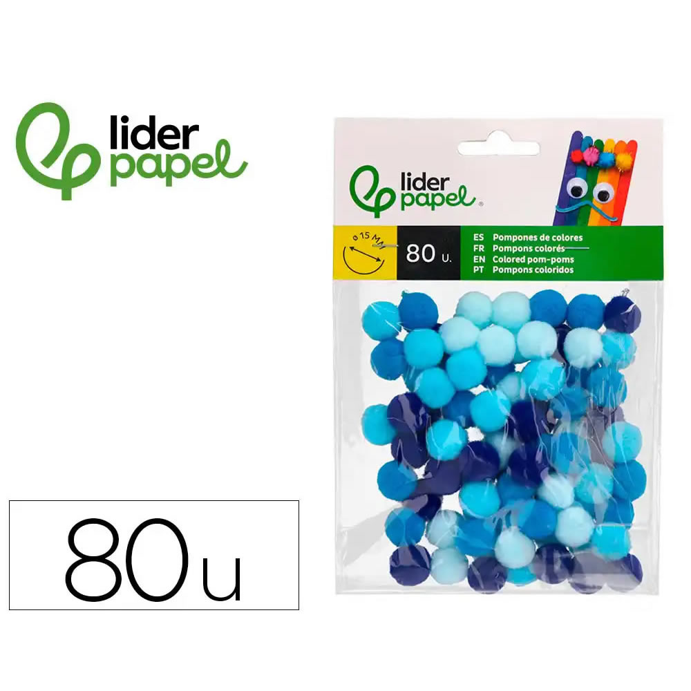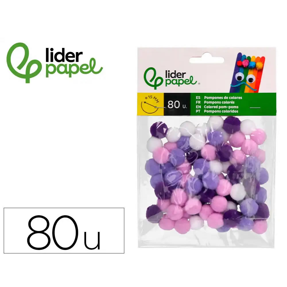 Pompones Glitter de colores y medidas surtidas. Colores: blanco, amarillo, naranja, rojo, rosa, azul, verde y morado. Medidas: 30 unidades de Ø 10 mm, 30 unidades de Ø 20 mm, 20 unidades de Ø 25 mm.