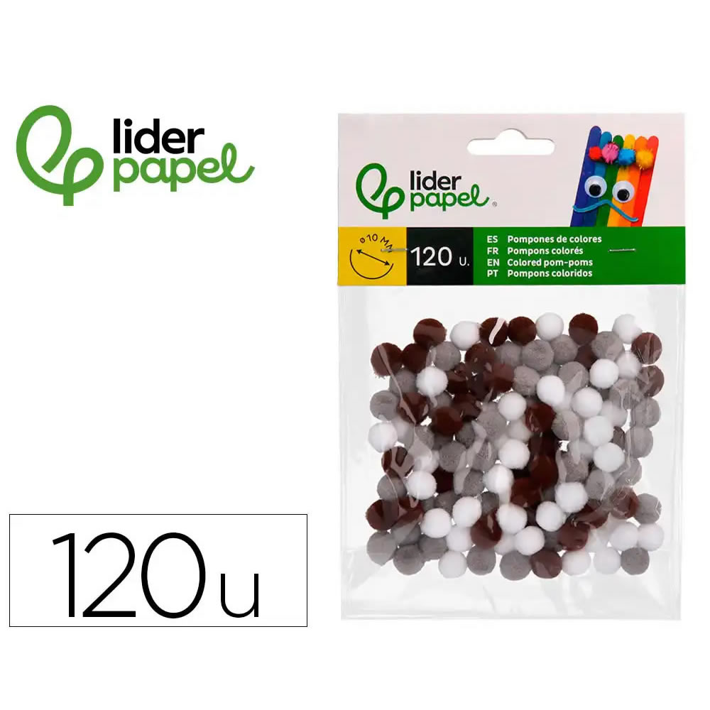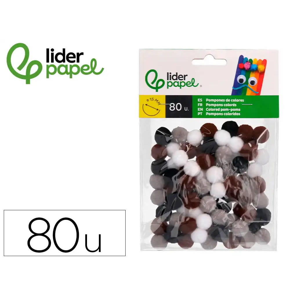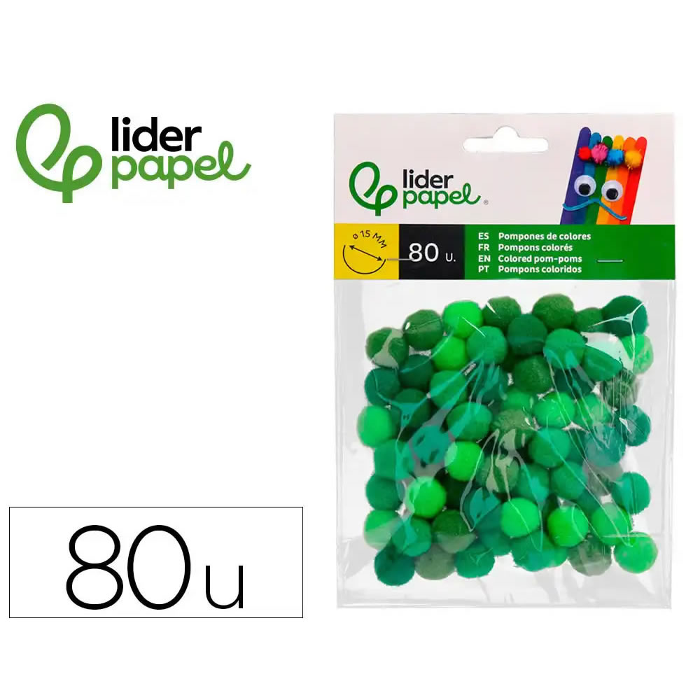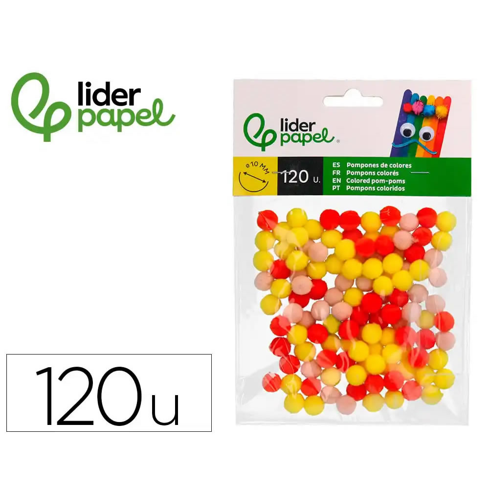 Pompones Glitter de colores y medidas surtidas. Colores: blanco, amarillo, naranja, rojo, rosa, azul, verde y morado. Medidas: 30 unidades de Ø 10 mm, 30 unidades de Ø 20 mm, 20 unidades de Ø 25 mm.
