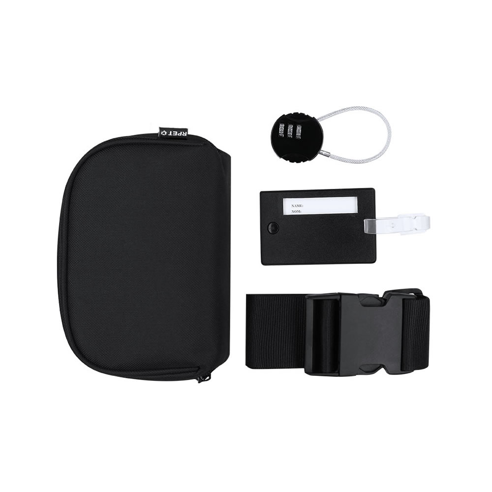 Set de viaje. Incluye: cinta ajustable para maletas, identificador de maletas y candado con contraseña numérica de 3 dígitos y cierre de cable de acero. Presentado en funda de RPET con cierre de crema...