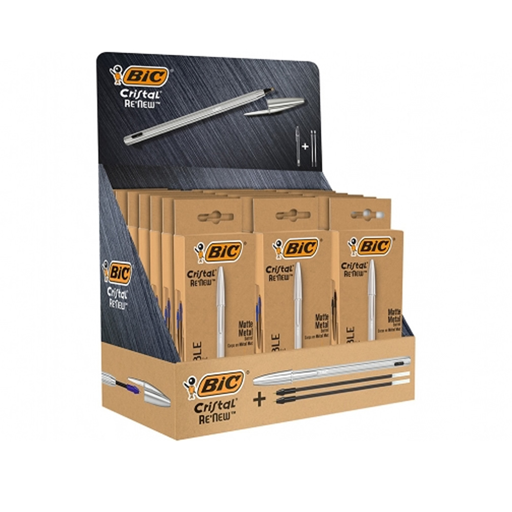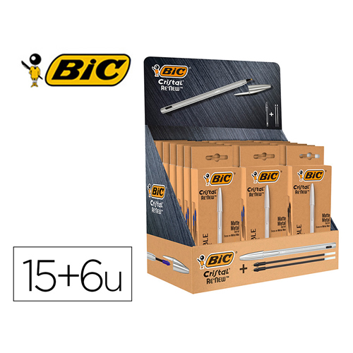 Bolígrafo Bic cristal renew 21 expositor 15 unidades azul + 6 negro.