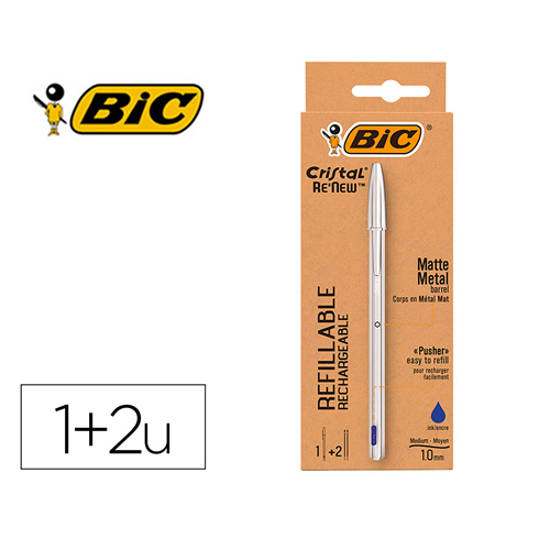 Ref. 997202 - Bic Cristal Re´new Pack de Boligrafo Recargable de Bola + 2 Recambios - Punta Redonda de 1.0mm - Trazo 0.32mm - Tinta con Base de Aceite - Cuerpo Metalico - Color Azul.