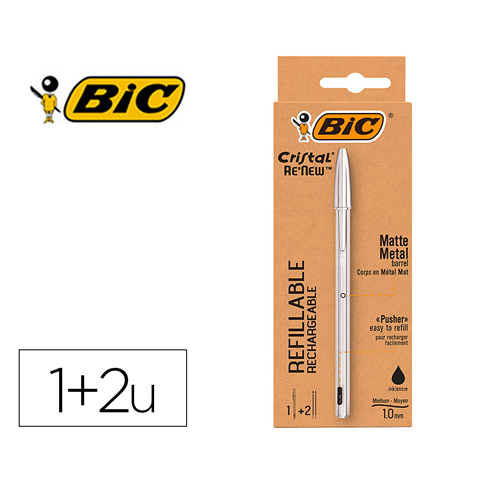 Ref. 997201 - Bic Cristal Re´new Pack de Boligrafo Recargable de Bola + 2 Recambios - Punta Redonda de 1.0mm - Trazo 0.32mm - Tinta con Base de Aceite - Cuerpo Metalico - Color Negro.
