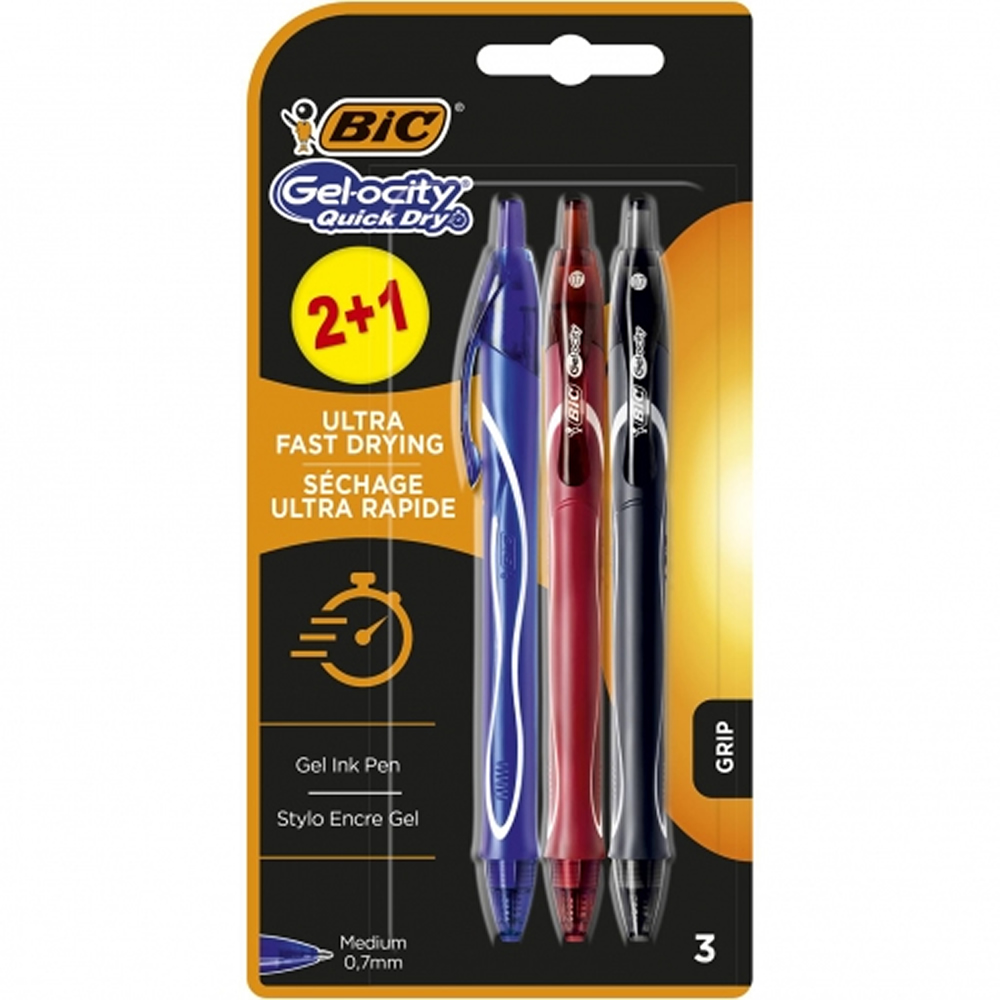 Ref. 972035 - Bic Gel-Ocity Quick Dry 2+1 Pack de 3 Boligrafos Retractiles - Grip de Goma - Punta Media de 0.7mm - Secado Ultra Rapido - No Mancha el Papel - Colores Surtidos.