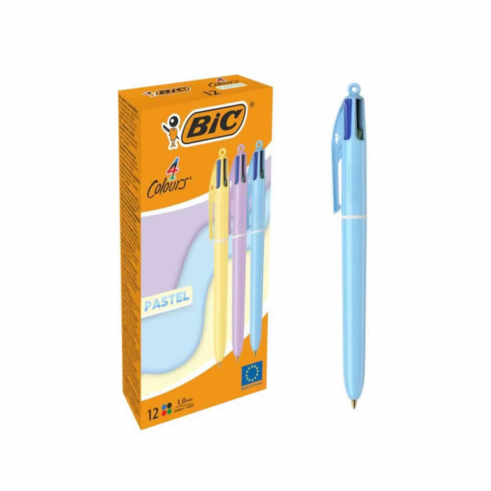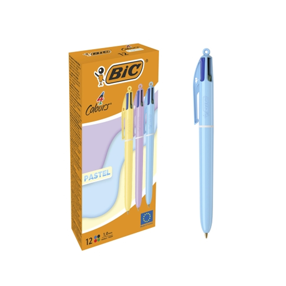 Esta versión del famoso boli BIC 4 Colores está disponible en 2 tonos pastel ?azul cielo y lila? que llenarán de alegría tus notas. Escribe en cuatro exuberantes colores ?rosa, morado, turquesa y verd...