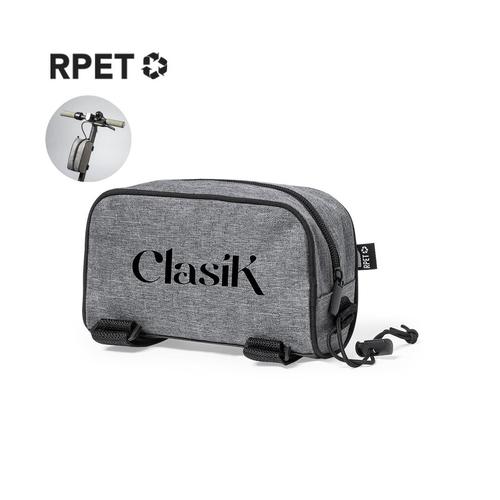 Bolsa para sillín fabricada en resistente 600D RPET. De acabado gris jaspeado.con ribetes de refuerzo y compartimento principal con cierre de cremallera. Incluye doble cinta de ajuste en barra y sillí...