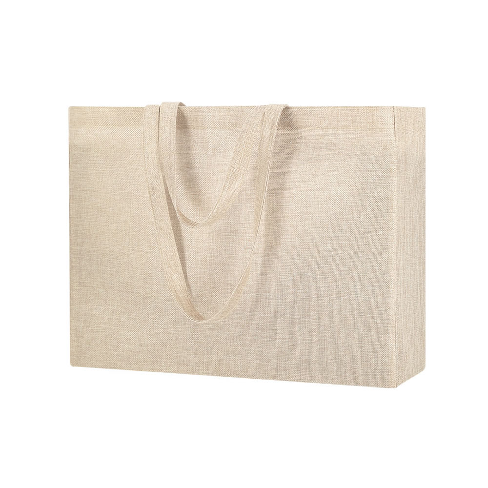 Bolsa fabricada en suave y resistente poliéster, ideal para personalización mediante impresión por sublimación. Con fuelle y asas largas reforzadas. Resistencia hasta 8 kg de peso.