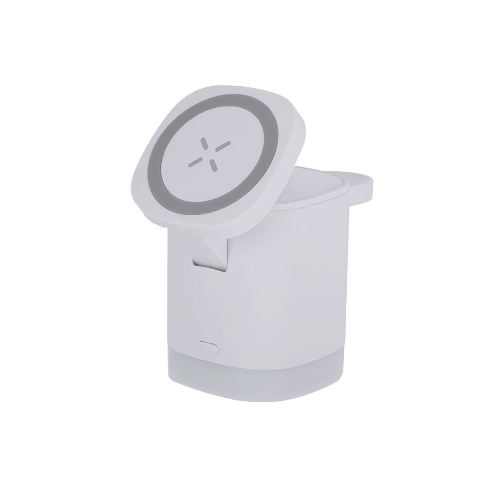 Cargador inalámbrico magnético 3 en 1 de 15W, fabricado en ABS reciclado (RABS). Diseñado para la carga simultánea del smartphone, auriculares y smartwatch. Cuenta con lámpara integrada en la base con...