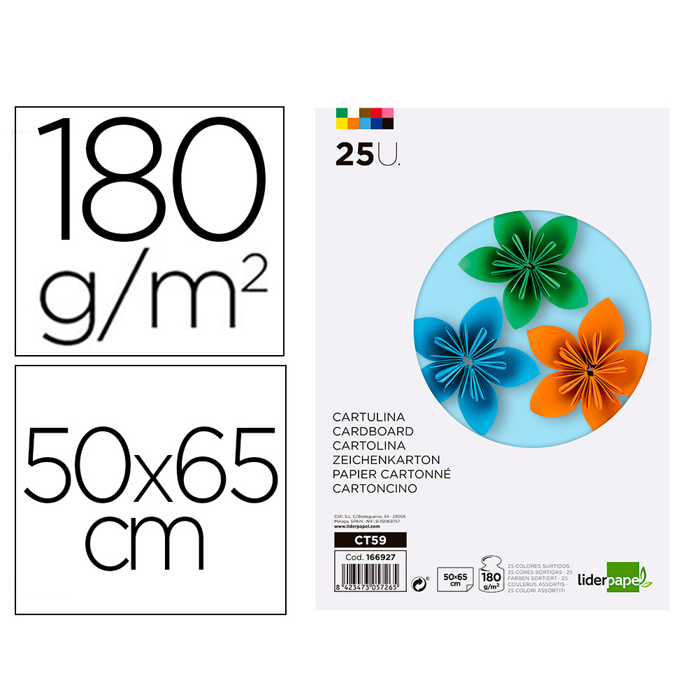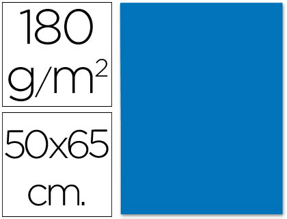 Cartulinas de colores de 180 g / m2. Aptas para uso escolar, con PH neutro, libres de cloro elemental (ECF y con colorantes directos biodegradables. Paquete de 25 cartulinas tamaño 50 x 65 cm.