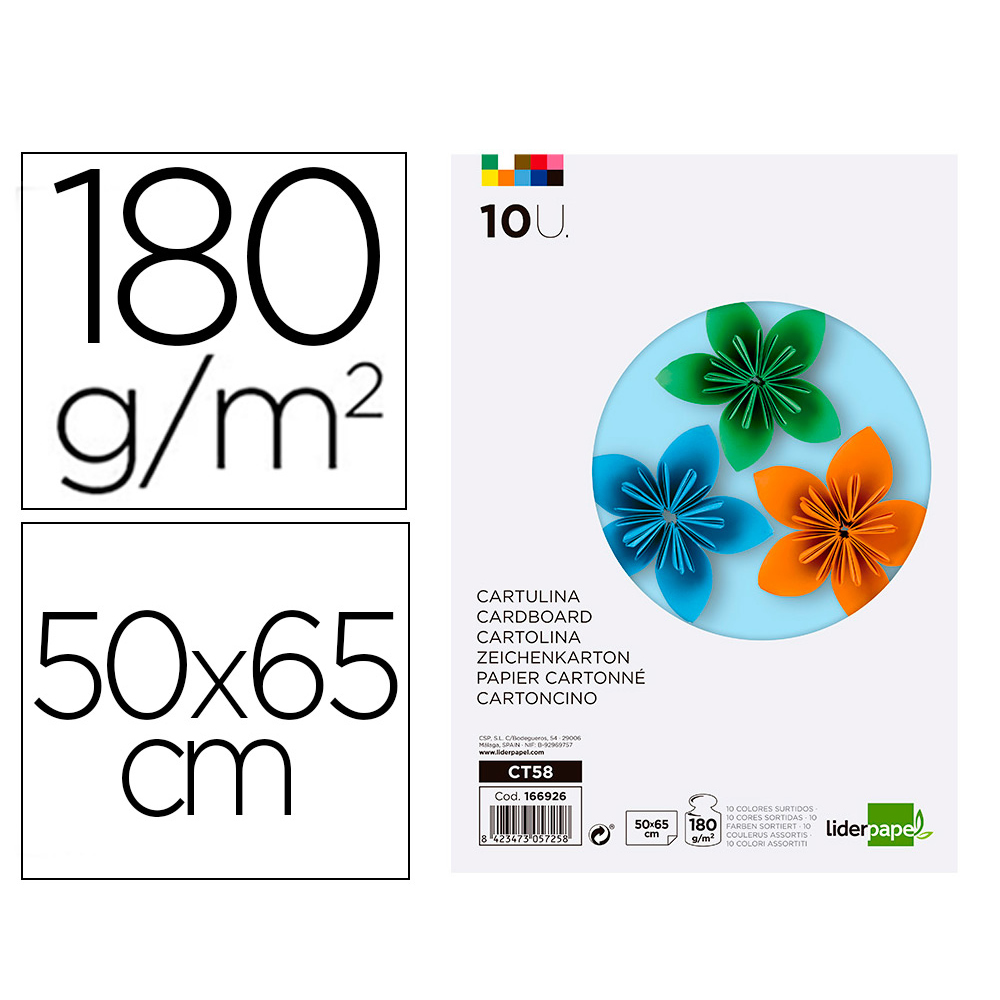 Cartulinas de 180 g / m2. Aptas para uso escolar, con PH neutro, libres de cloro elemental (ECF) y con colorantes directos biodegradables.