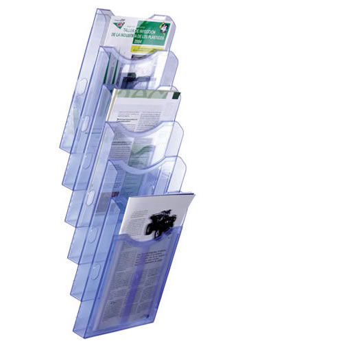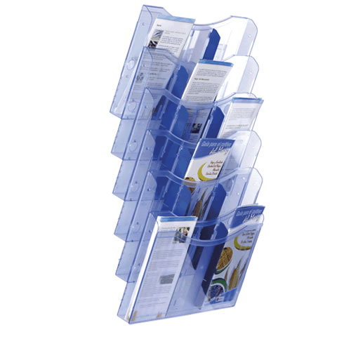 Ref. AD6126AZTP - Expositor mural Archiplay Archivo 2000 con 6 compartimentos DIN A4 vertical. Medidas exteriores: 190x235x685 mm. Color azul transparente.