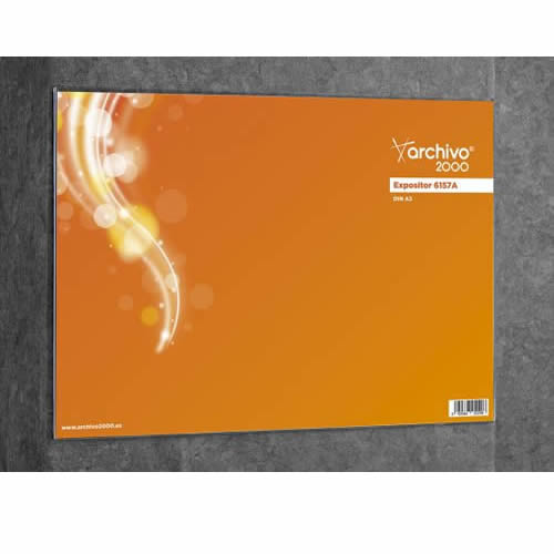 Expositor mural Archivo 2000 con adhesivo DIN A3 horizontal. Fabricado en poliestireno ultra transparente de gran calidad y resistencia. Evita dañar la superficie de fijación. No es necesario quitar e...