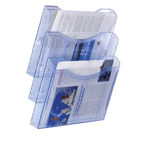 Ref. AD6123AZTP - Portadocumentos mural Archiplay Archivo 2000 con 3 compartimentos DIN A4 vertical. Medidas exteriores: 105x235x445 mm. Color azul transparente.