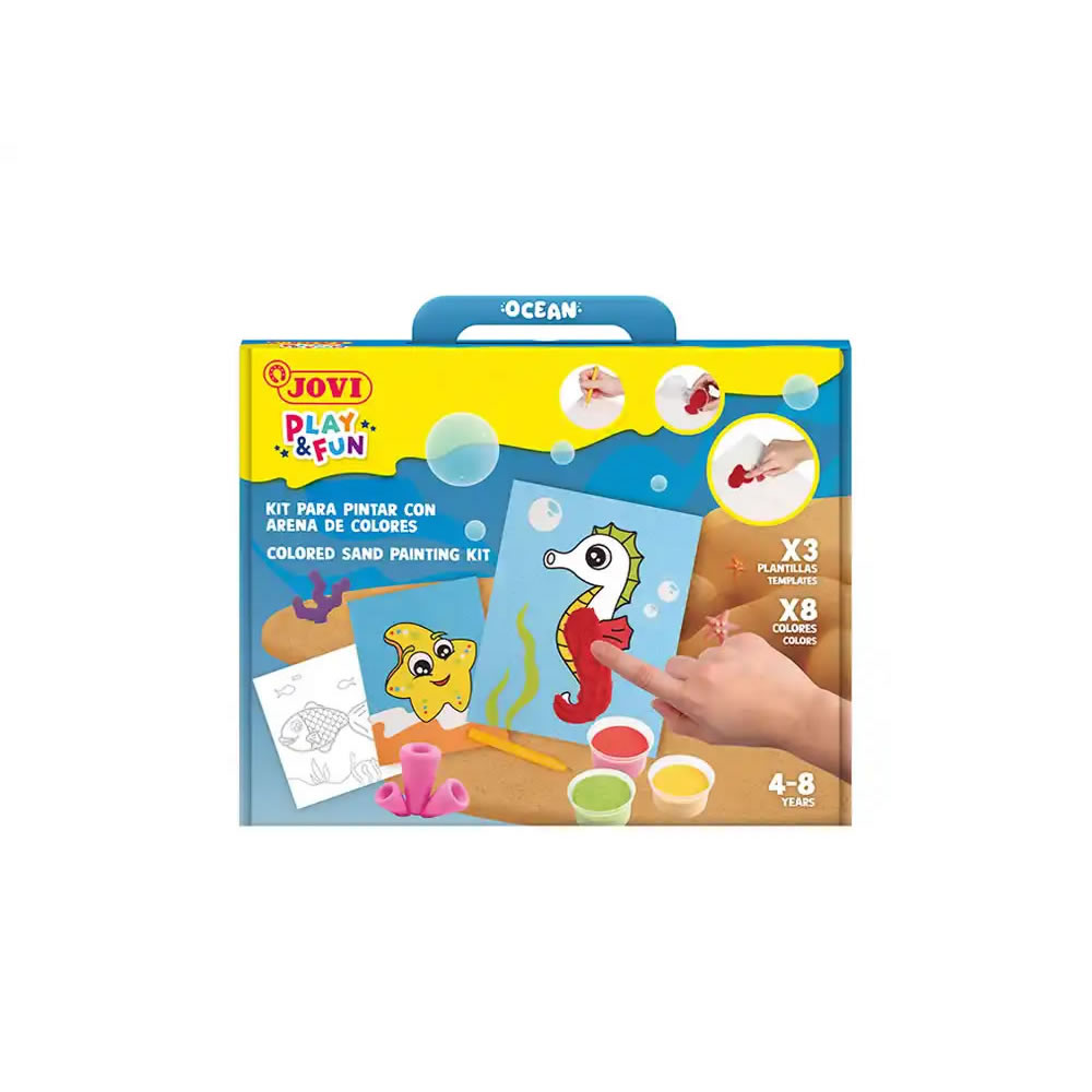 Ref. JO2102 - Jovi Play & Fun Kit Pinta con Arena Ocean con 8 Botes de Arena + 1 Punzon + 3 Laminas con Diseños de Animales Acuaticos - Colores Surtidos.