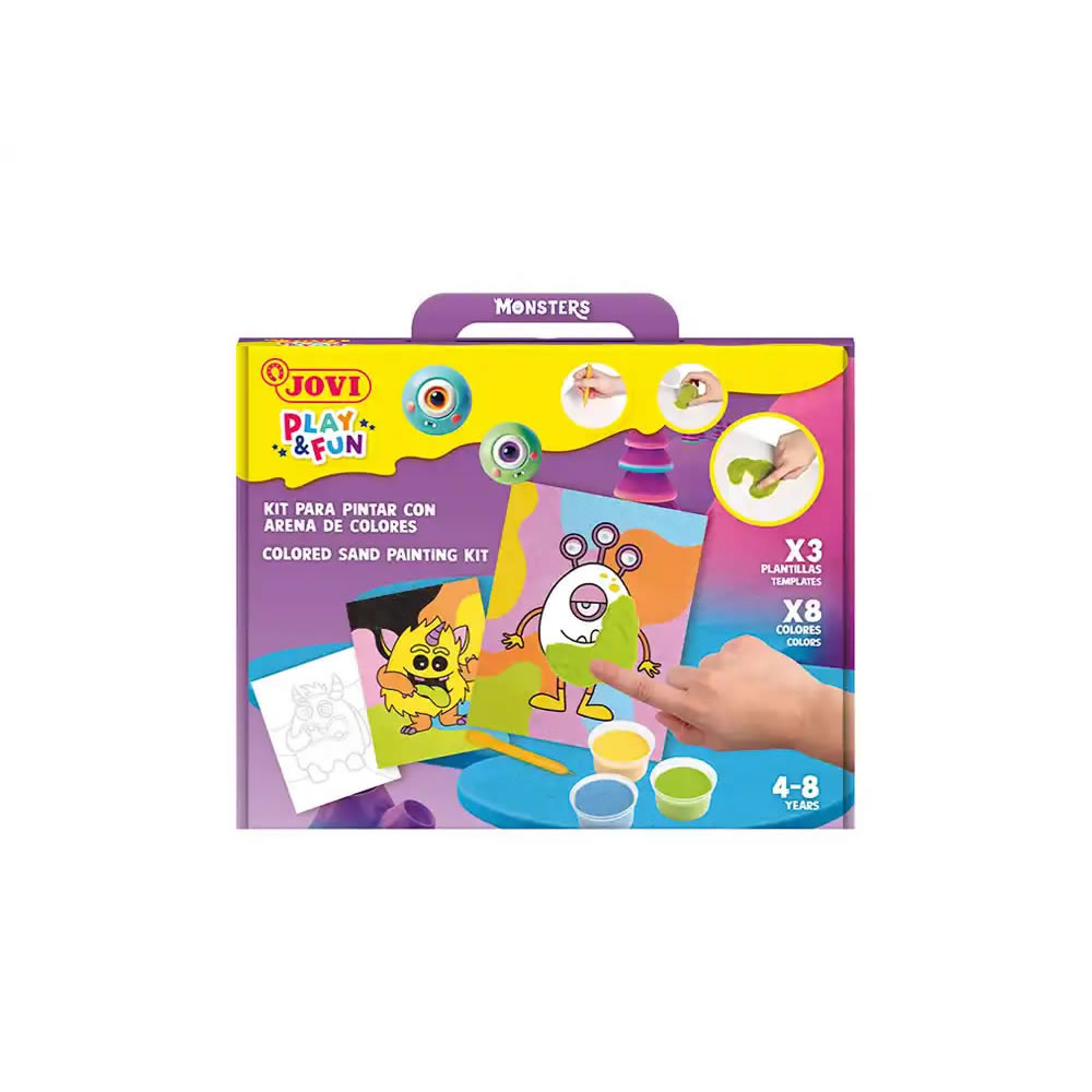 Ref. JO2103 - Jovi Play & Fun Kit Pinta con Arena Monsters con 8 Botes de Arena + 1 Punzon + 3 Laminas con Diseños de Monstruos - Colores Surtidos.