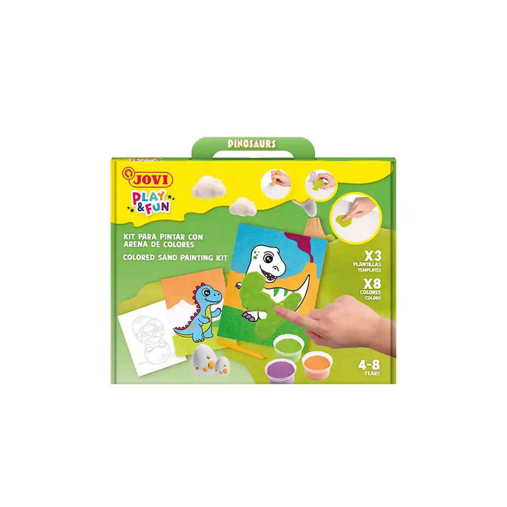 Ref. JO2106 - Jovi Play & Fun Kit Pinta con Arena Dinosaurs con 8 Botes de Arena + 1 Punzon + 3 Laminas con Diseños de Dinosaurios - Colores Surtidos.