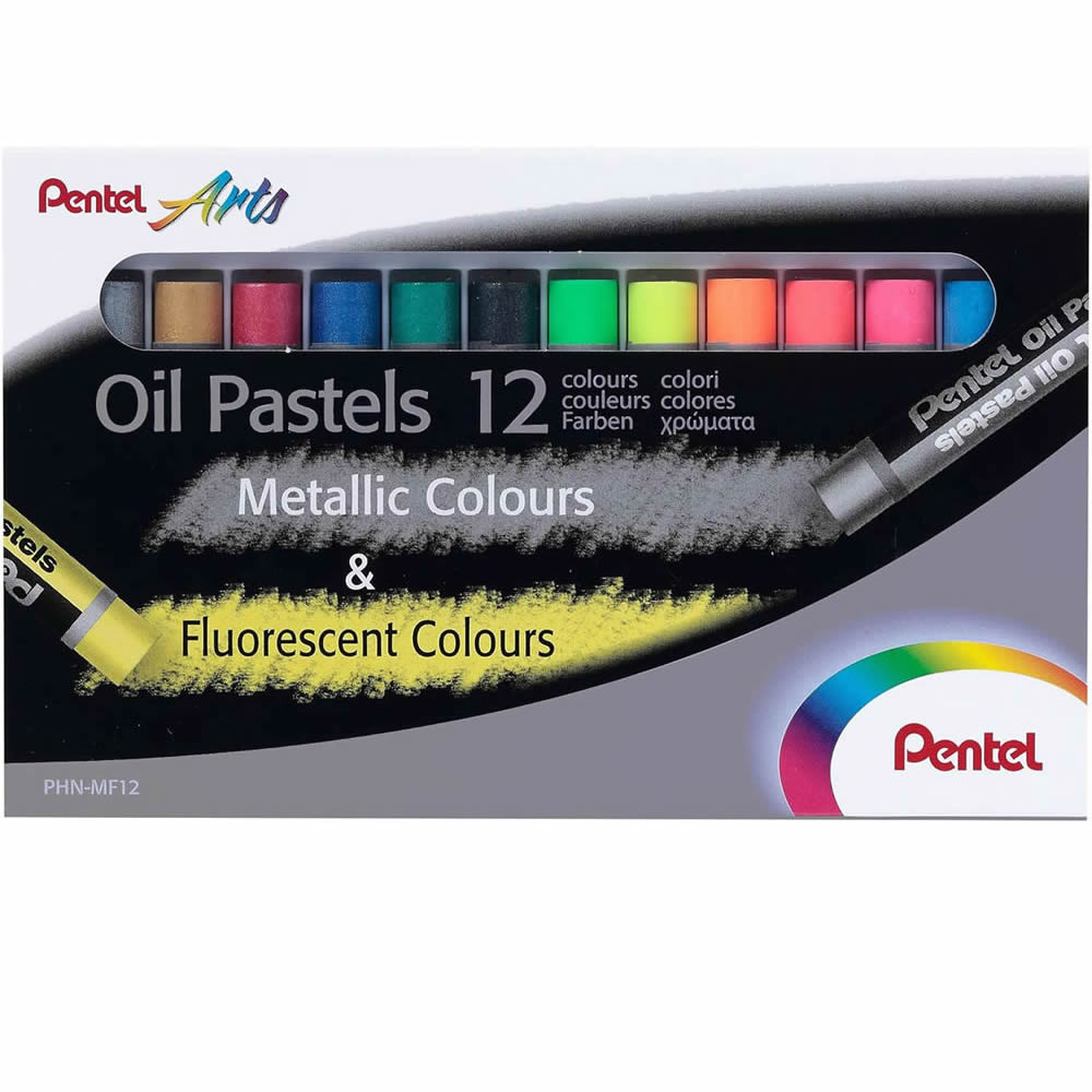 Ref. PHN-MF12 - Pentel Oil Pastels Pack de 12 Pasteles Oleo - 6 Metalicos y 6 Fluorescentes - Blandos, Cremosos y de Secado Lento - Colores Metalicos y Fluorescentes Surtidos.