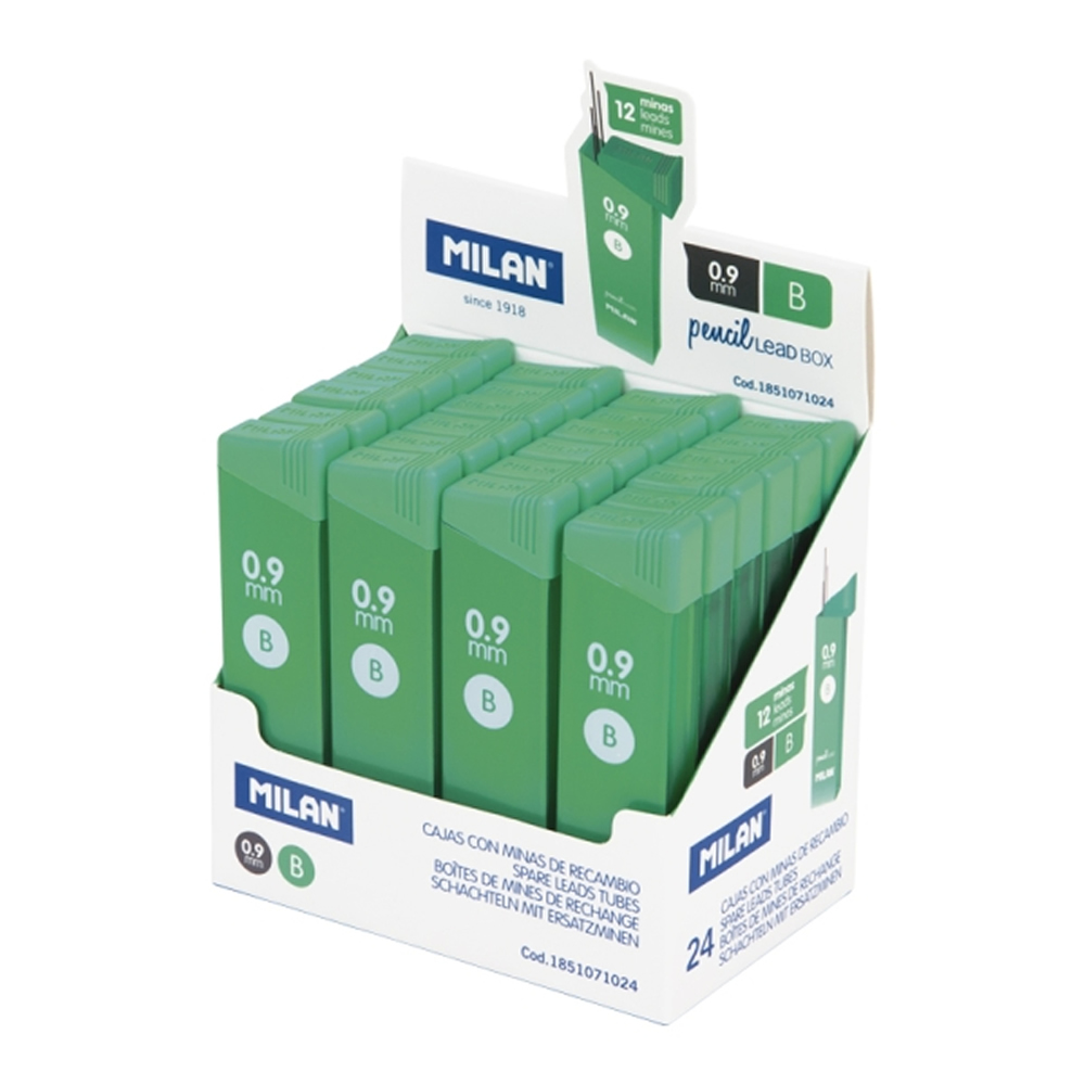 Ref. MI1851071024 - Milan Expositor con 24 Cajas de 12 Minas Grafito 0.9mm - Dureza B - Color Gris Oscuro.
