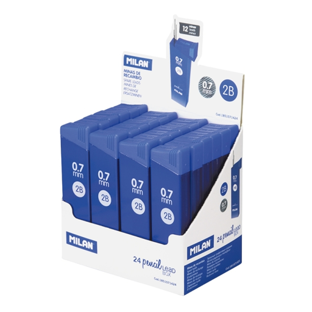 Ref. MI1851071524 - Milan Expositor con 24 Cajas de 12 Minas 0.7mm - Dureza HB - Color Azul.