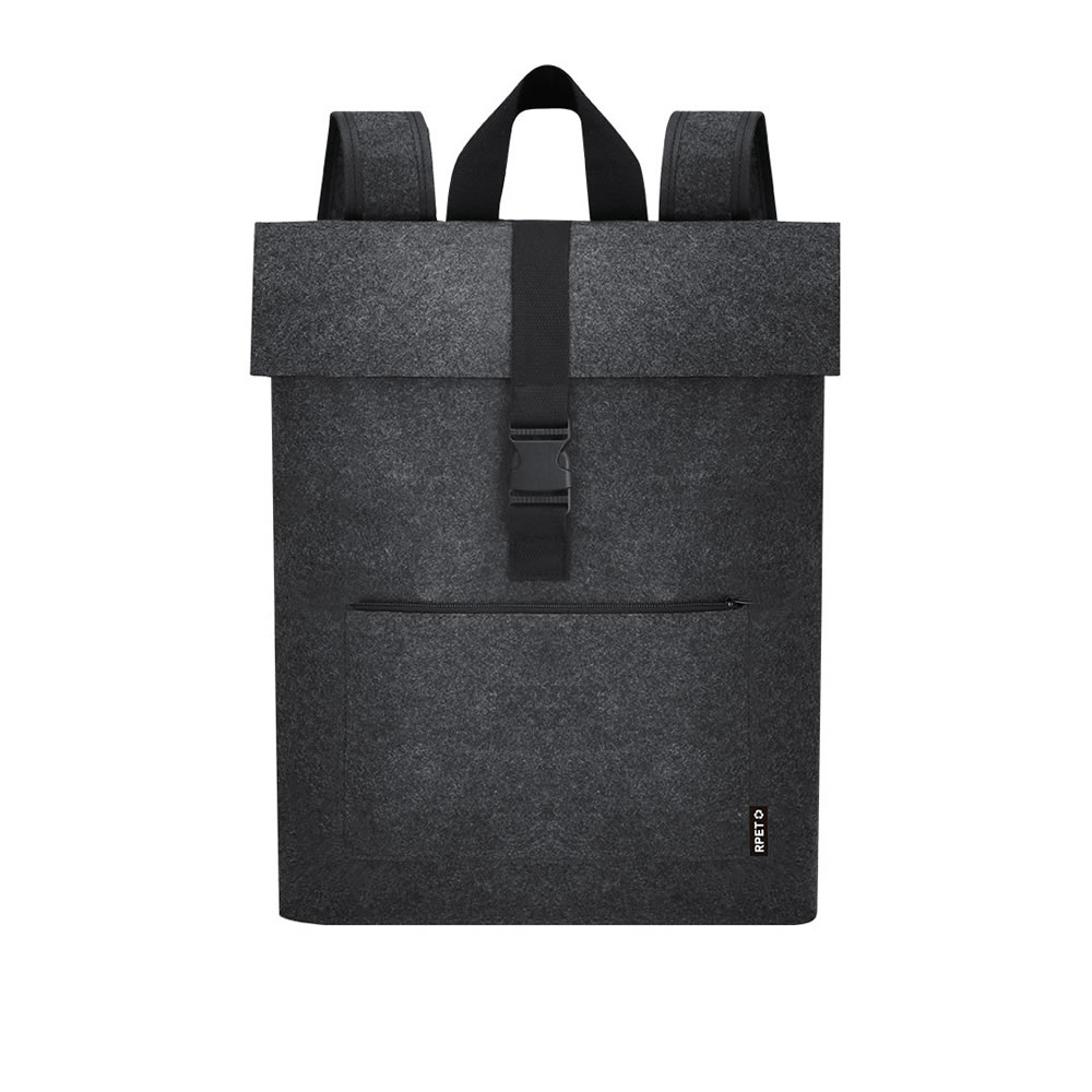 Mochila de diseño fabricada en resistente fieltro RPET, con tiras de cierre, asa de transporte y cintas para hombros en polipiel. Amplio compartimento principal, solapa con tiras ajustables y cierre d...