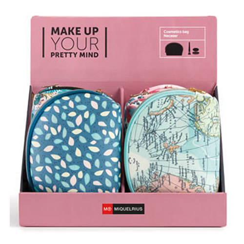 Expositor de 12 neceseres ovalados (4 unidades por modelo: Wildblue, Desert y Fruit). Neceser ovalado con tamaño compacto, ideal para almacenar cosméticos o artículos de belleza. Cierre cremallera y t...