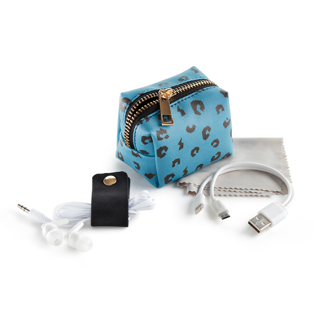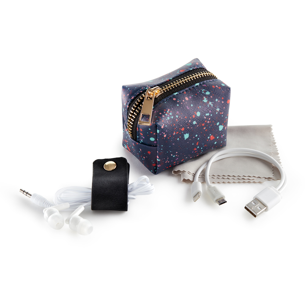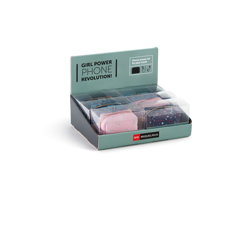 Exp.6 Neceseres Tech Lifestyle. Expositor de 6 mini neceseres con contenido tecnológico. El kit ideal para ir de viaje o para una escapada en tren o avión. Neceser de símil piel con cremallera y tirad...