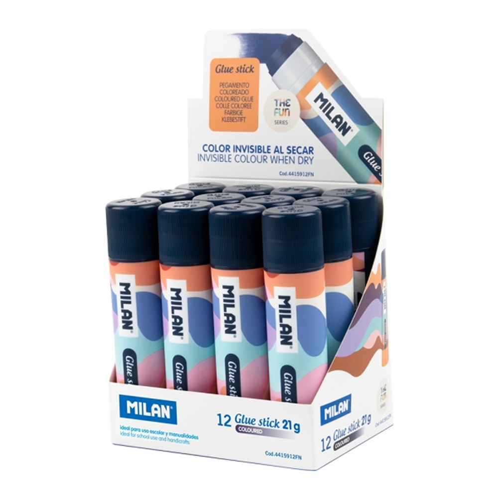 Ref. 4415912FN - Milan The Fun Expositor con 12 Barras de Pegamento 21g - Multiusos - Multisuperficies - Sin Disolventes - Uso Escolar - Multicolor.