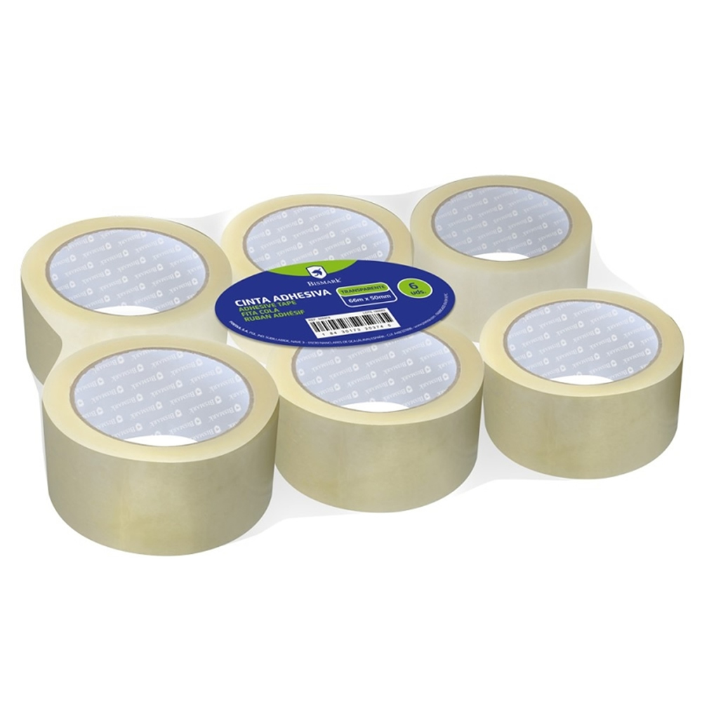 Cinta adhesiva para embalaje, básica y versátil. 50 mm de ancho y 66 metros de largo. Precinto para embalar transparente, fabricado con plástico, polipropileno, de 31 micras de grosor.