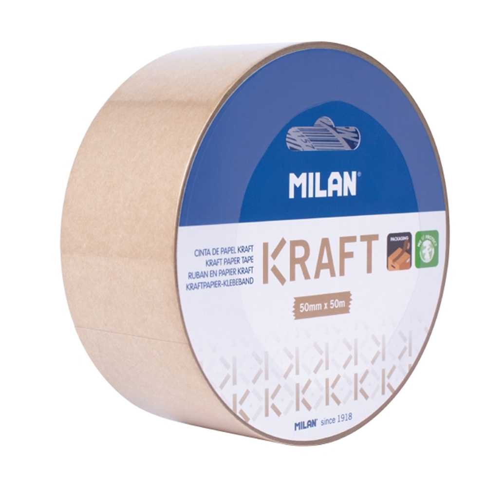 Cinta de papel kraft de 50mm de ancho y 50 metros de longitud de la marca Milan, resistente y ecológica para embalaje.