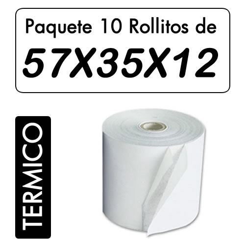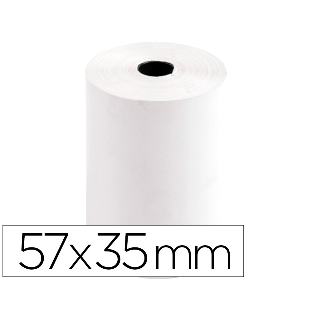 Rollo de papel térmico blanco tamaño 57 x 35 x 12 mm (ancho del tique x diámetro del rollo x diámetro del mandril). Gramaje: 55 g / m².