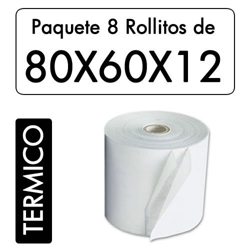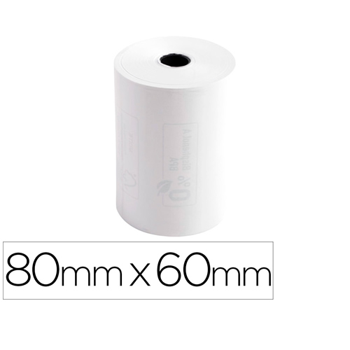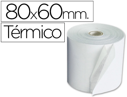 Rollo de papel térmico blanco tamaño 80 x 60 x 12 mm (ancho del tique x diámetro del rollo x diámetro del mandril). Gramaje: 55 g / m².