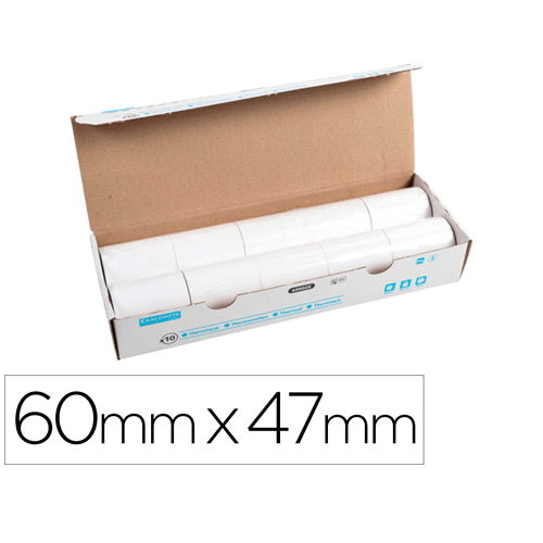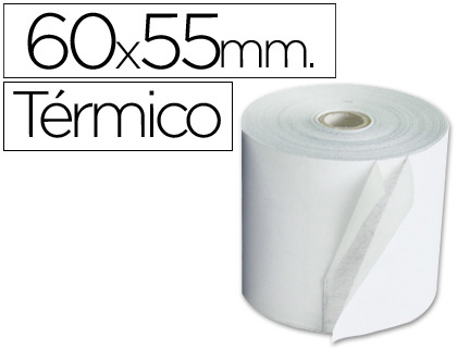 Rollo de papel térmico blanco tamaño 60 x 55 x 12 mm (ancho del tique x diámetro del rollo x diámetro del mandril). Gramaje: 55 g / m².