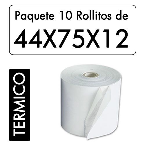 Rollo de papel térmico blanco tamaño 44 x 70 x 12 mm (ancho del tique x diámetro del rollo x diámetro del mandril). Gramaje: 55 g / m².