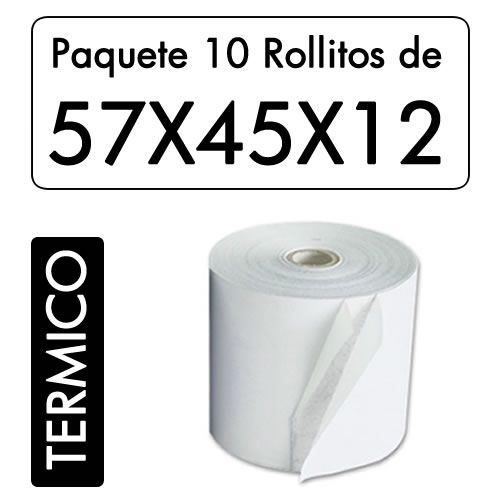 Rollo de papel térmico blanco tamaño 57 x 45 x 12 mm (ancho del tique x diámetro del rollo x diámetro del mandril). Gramaje: 55 g / m².