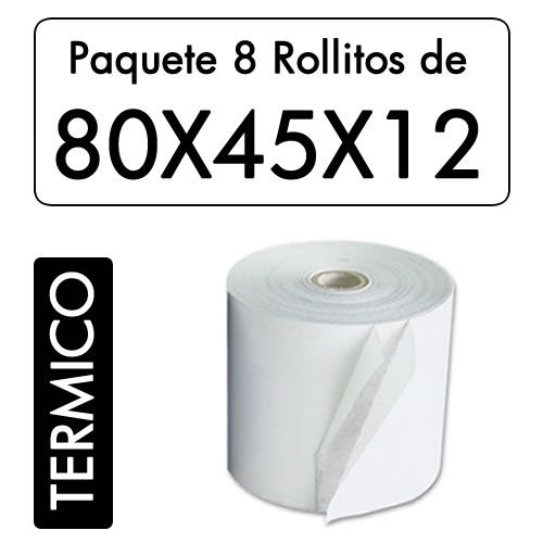 Rollo de papel térmico blanco tamaño 80 x 45 x 12 mm (ancho del tique x diámetro del rollo x diámetro del mandril). Gramaje: 55 g / m².