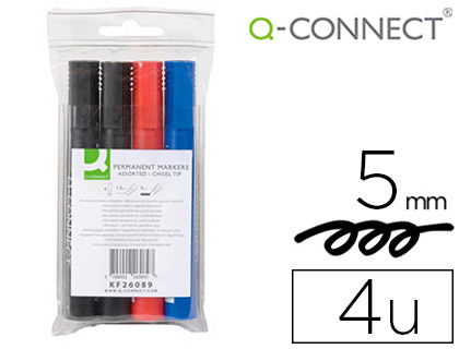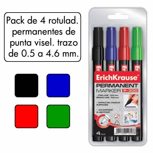 Estuche de 4 rotuladores permanentes punta viselada surtidos en 4 colores, negro, azul, rojo y verde. Ancho de trazo de 0.5 a 4.6 mm. Â Apto para casi todas las superficies: papel, carton, vidrio, pla...