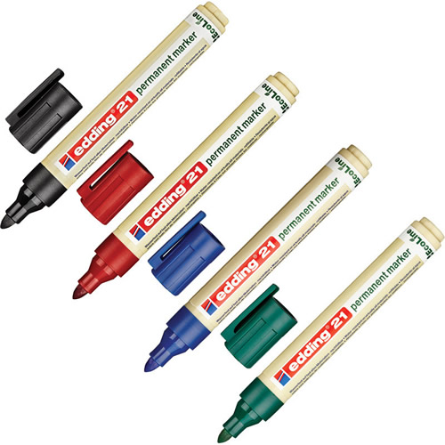 Ref. 1021-4-S - Edding 21 EcoLine Pack de 4 Rotuladores Permanentes - Punta Redonda - Trazo entre 1.5 y 3mm - 90% de Plastico Reciclado - Colores Surtidos.