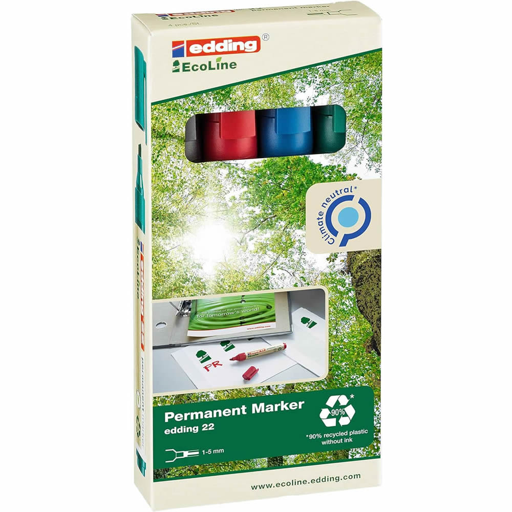 Ref. 1022-4-S - Edding 22 EcoLine Pack de 4 Rotuladores Permanentes - Punta Biselada - Trazo entre 1 y 5mm - 90% de Plastico Reciclado - Colores Surtidos.