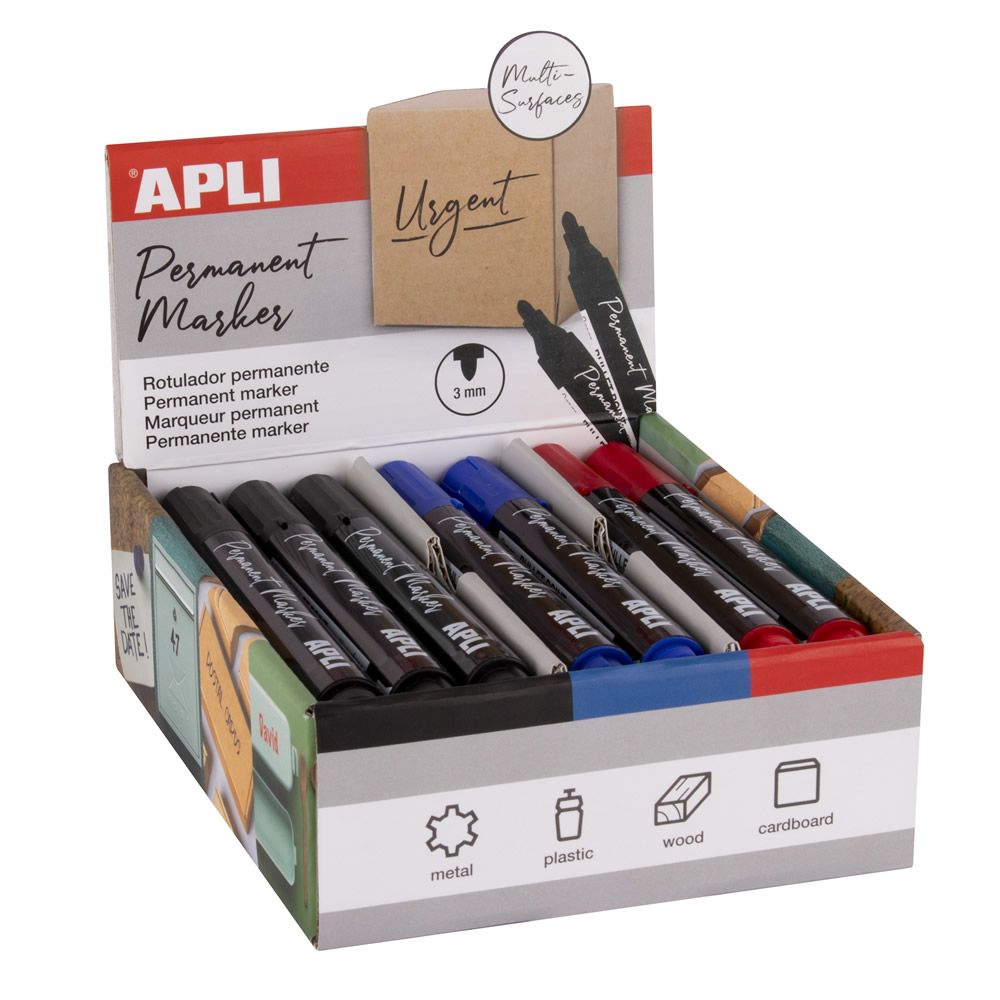 Ref. 19685 - Apli Pack de 4 Rotuladores Permanentes Punta Redonda - Resistentes al Agua - Multifuncionales - para Metal, Plastico, Madera y Carton - Color Azul Negro Rojo.
