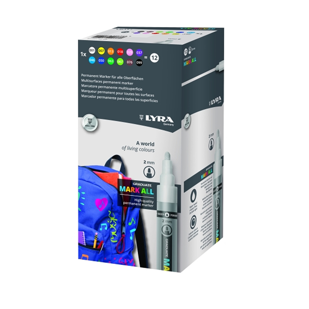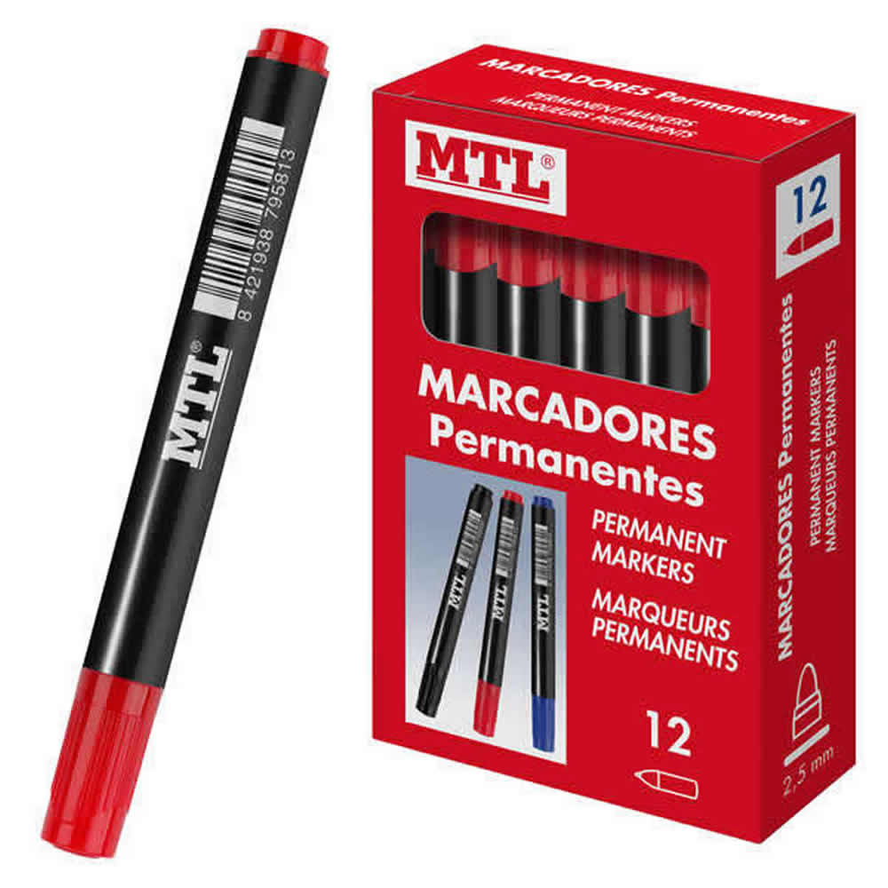 Marcadores con tinta resistente al agua y secado rápido. Cuerpo de plástico, punta cónica con trazo de 2 mm y clip en la capucha. Rotula prácticamente en cualquier superficie.
