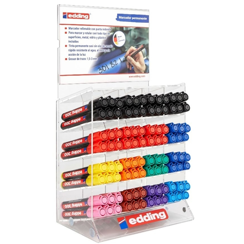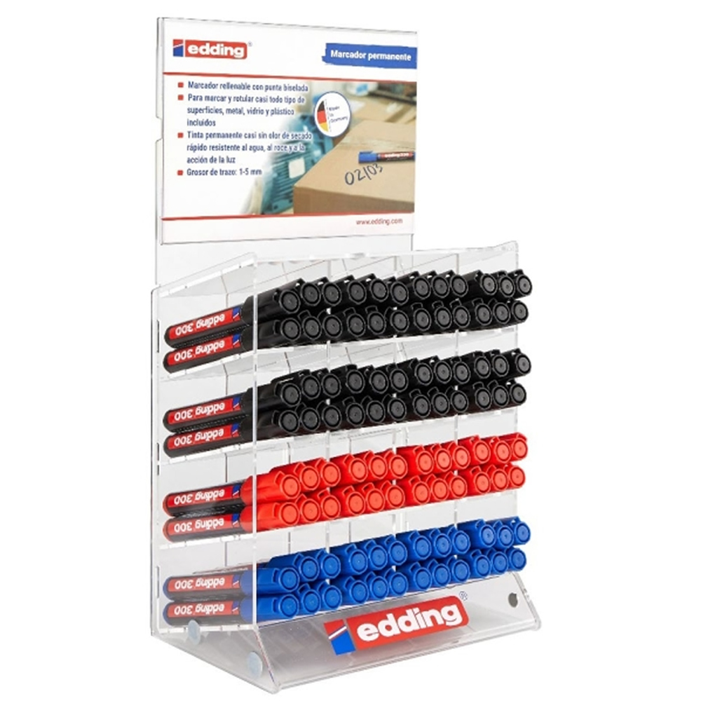 Ref. 4-70300-M - Edding 300 Expositor de 96 Rotuladores Permanentes - Punta Redonda - Trazo entre 1.5 y 3mm - Tinta Casi Inodora - Capuchon con Clip - Secado Rapido - Colores Negro, Azul y Rojo.