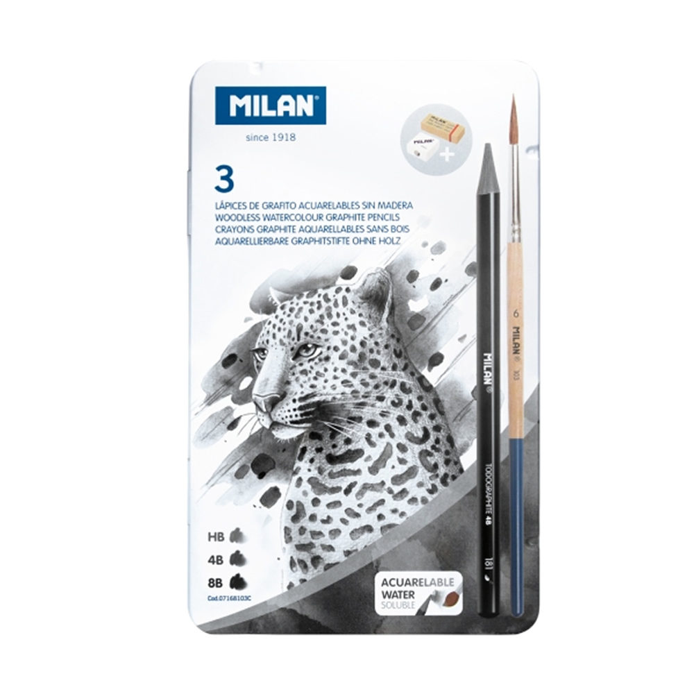 Ref. 07168103C - Milan Pack de 3 Lapices de Grafito Acuarelables Surtidos + Sacapuntas + Goma de Borrar + Pincel - Caja Metalica - Bandeja Interior - Color Gris Oscuro.