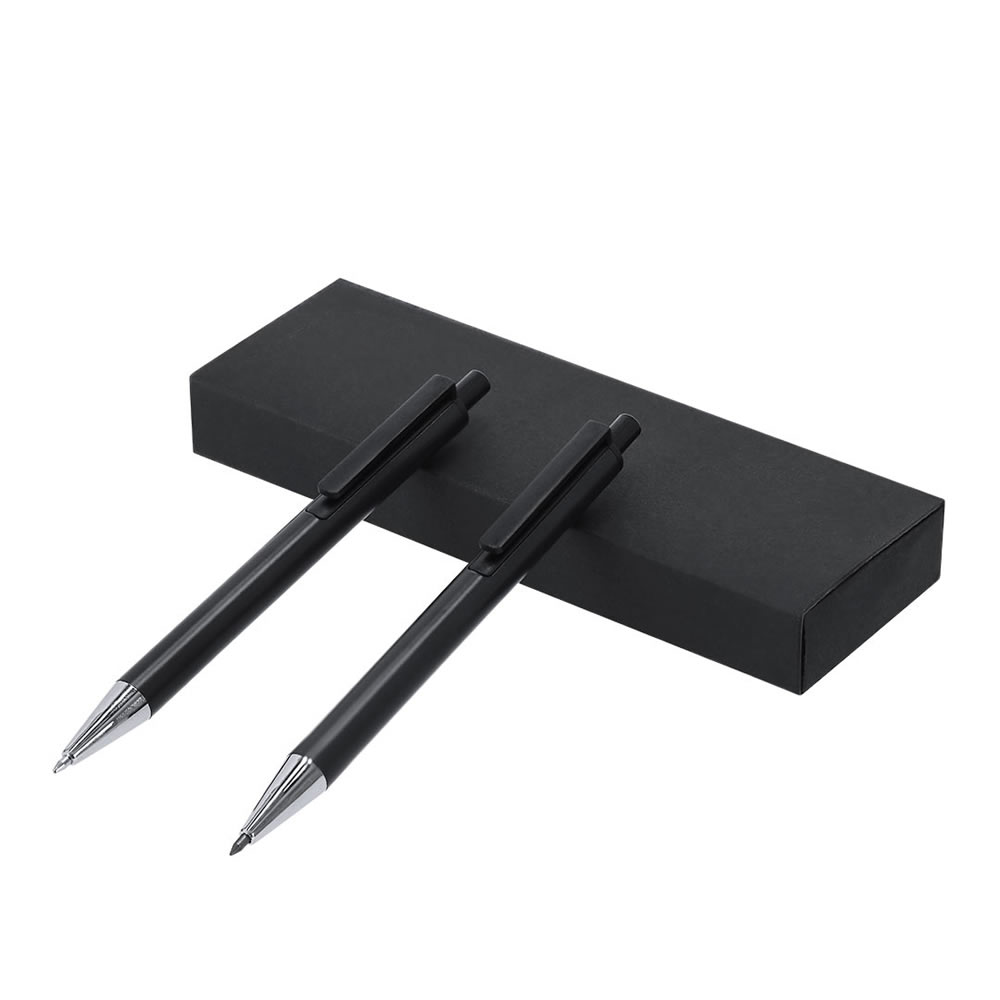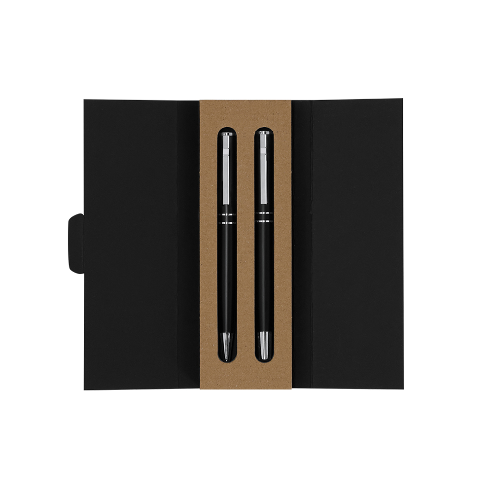 Elegante set de bolígrafo y roller. Bolígrafo de mecanismo giratorio y roller con capucha, ambos provistos de un clip metálico. Con tinta azul, su cuerpo presenta un elegante acabado negro mate y suti...