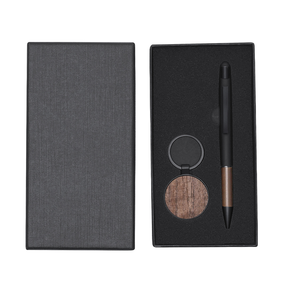 Elegante set en madera de nogal y detalles metálicos en negro mate. Incluye:-Bolígrafo de acabado negro mate y detalles en madera de nogal. Con mecanismo pulsador y tinta azul.-Llavero en madera de no...