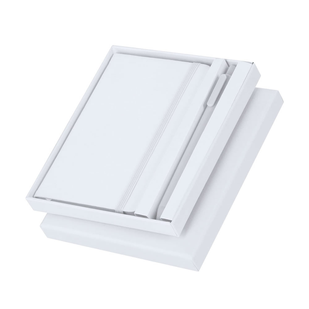 Set de bloc de notas y bolígrafo, además de un bidón térmico fabricado en acero inox.El set incluye:- Bloc de notas de PU de tapas rígidas y suaves, con 80 páginas a rayas, banda elástica y marcapágin...
