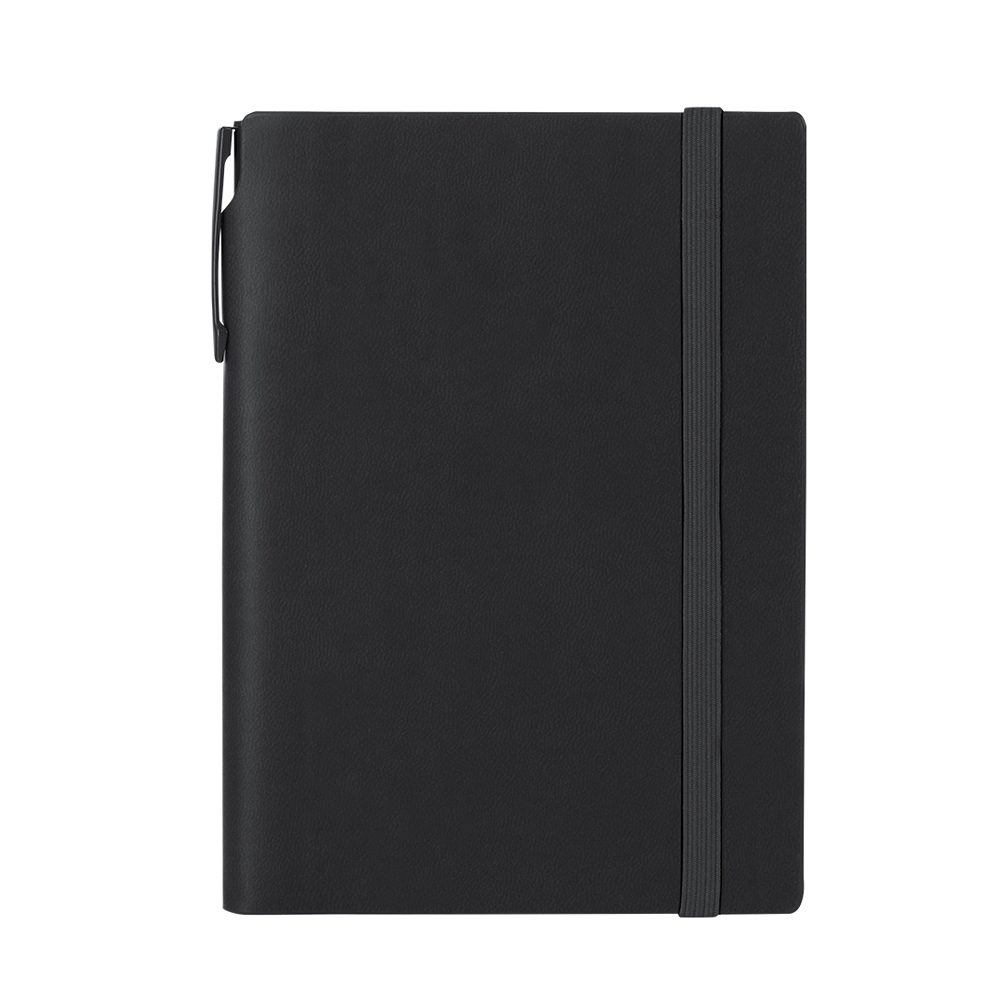 Set de bloc de notas y bolígrafo fabricados en PU. El set incluye: - Bloc de notas fabricado en PU. Incluye 80 páginas de color crema con líneas, marcapáginas y cinta elástica de cierre a juego. - B...