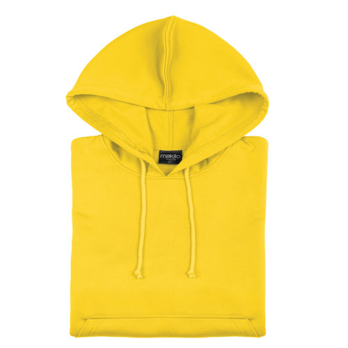 Sudadera tecnica adulto Theon 100% poliester 265g / m2. Color amarillo. Talla Small. Codigo de impresion E(6), N(8), O, P, R. Sudadera técnica para adulto unisex. Con capucha, cintas de ajuste, bolsill...